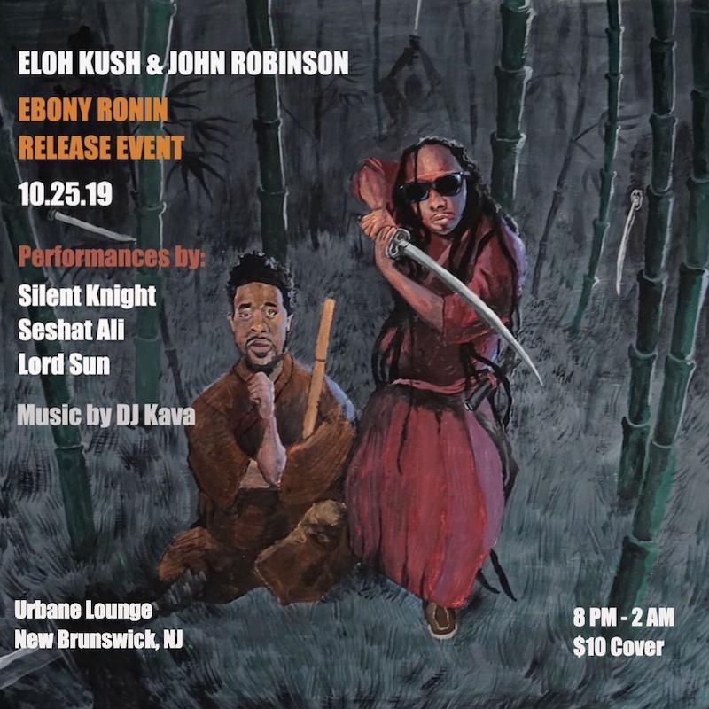 Join Eloh Kush and John Robinson for the official release of their new EP, Ebony Ronin. Live performances by Silent Knight, Seshat Ali, and Lord Sun, with music by DJ Kava. Oct. 25, 2019, 8 pm – 2 am, at the Urbane Lounge, 124 Church Street, New Brunswick, NJ.